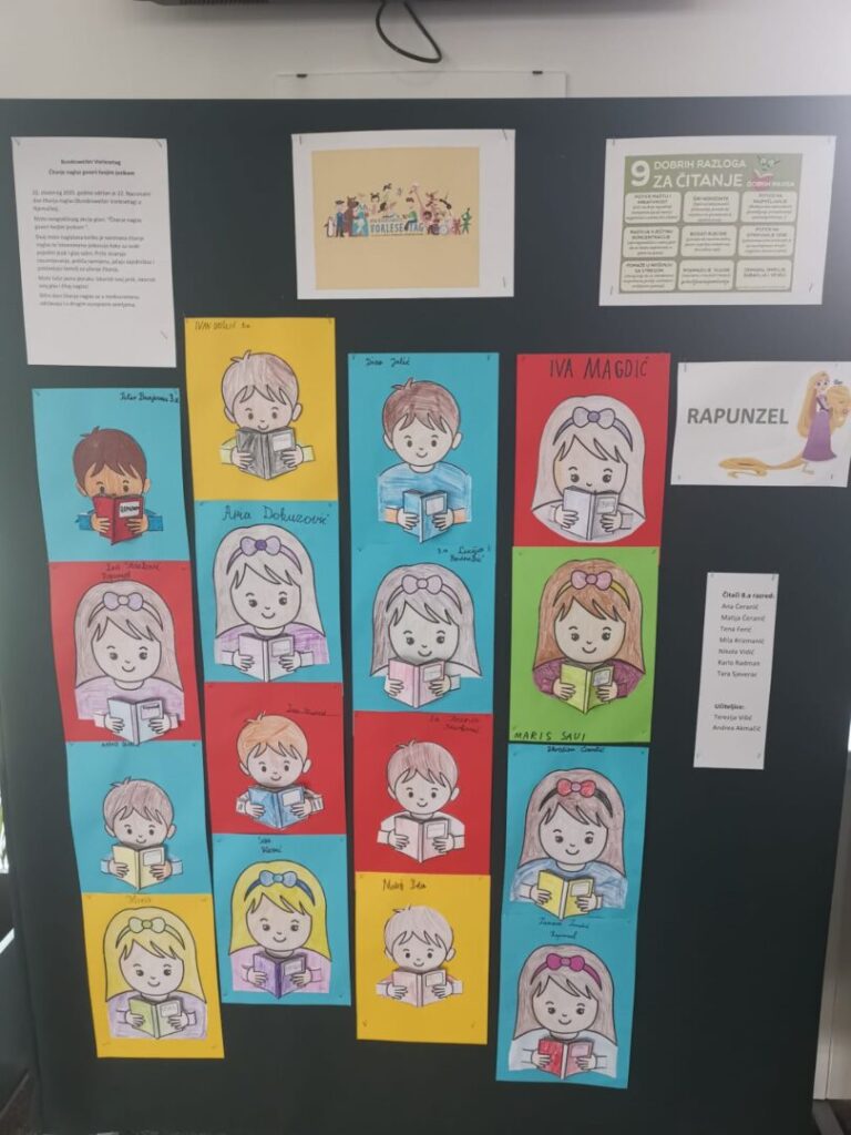 Prvo su učenici 8.a razreda čitali učenicima 3. razreda, koji su slušali radoznalo i strpljivo bajku „Rapunzel „ ( Zlatokosa) na njemačkom jeziku. Nakon što su slušati učenike izborne nastave Njemačkog jezika, imali su priliku i čuti kako čita Nikola Vidić (učenik koji je živio i pohađao školu u Njemačkoj od 1. do 6. razreda ). Snimku čitanja svih učenika možete čuti u prilogu.