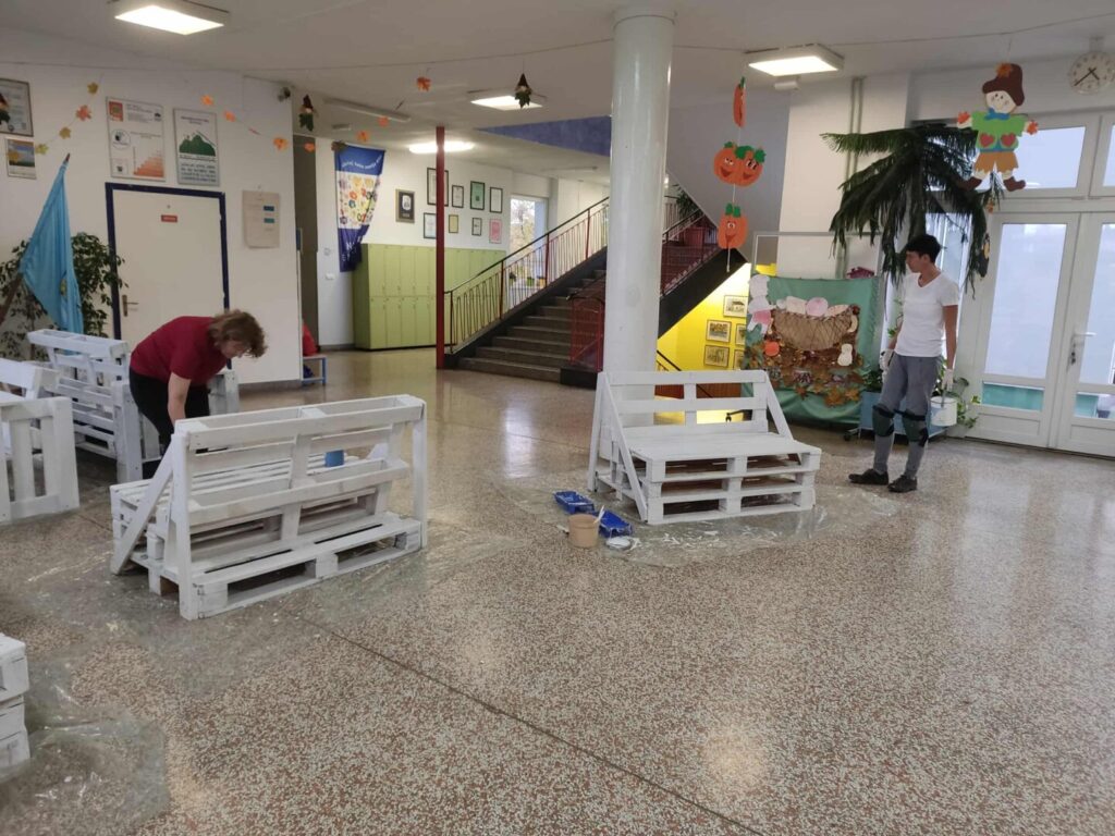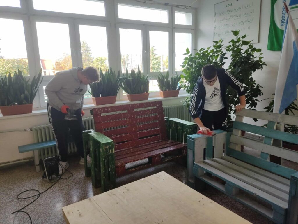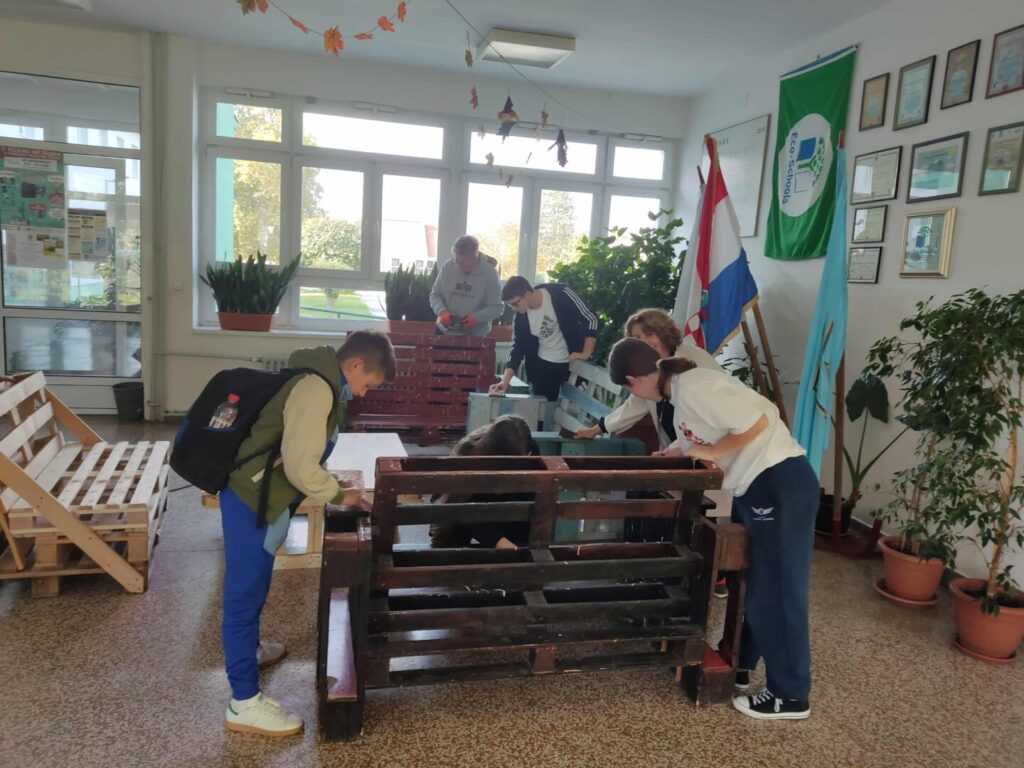 U obnovi klupa od paleta u školskom holu sudjelovali su učenici. Brusili su i pripremali za bojanje : Karlo Radman, Matija Ćeranić, Tena Ferić, Tara Sjeverac i Matijas Filipović. Bojali su učenici, članovi modela : Fran Čančar, Noa Ivanišević, Bruno Kraft, Bartol Prpić, Rita Tomašić i Petra Andrašić.
