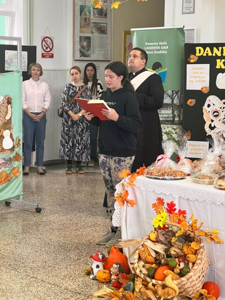 „Želimo da vas blagoslov kruha i plodova zemlje prati kroz cijelu godinu u vašim domovima i srcima“, istaknule su učenice Marta Štivin i Eva Pristaš (pripremila vjeroučiteljica Martina Tomašić).