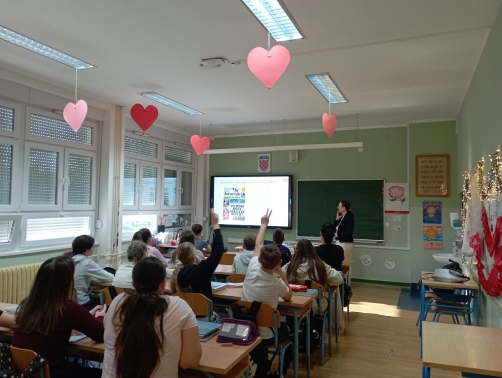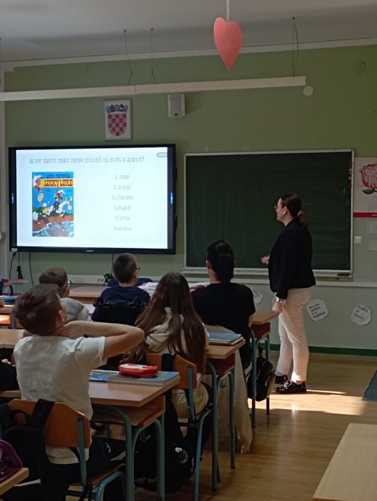 U utorak 24. ožujka 2026. učenici 5.b razreda sudjelovali su u zanimljivom i poučnom nastavnom satu koji je održala školska knjižničarka na temu „Tisak“. Kroz interaktivno izlaganje učenici su upoznali povijest tiskarstva – naučili su tko je i kada izumio tiskarski stroj, koja se knjiga smatra prvom tiskanom knjigom te što sve obuhvaća pojam tiska. Također su doznali koje sve vrste tiskovina postoje i tko je zaslužan za pokretanje prvih tiskanih novina u Hrvatskoj.