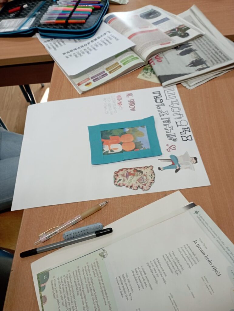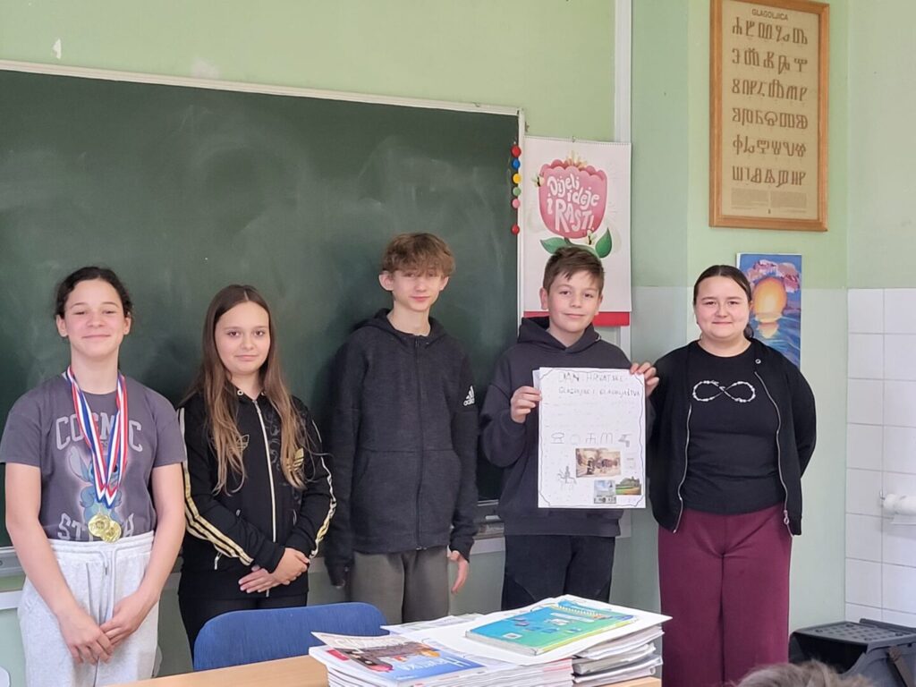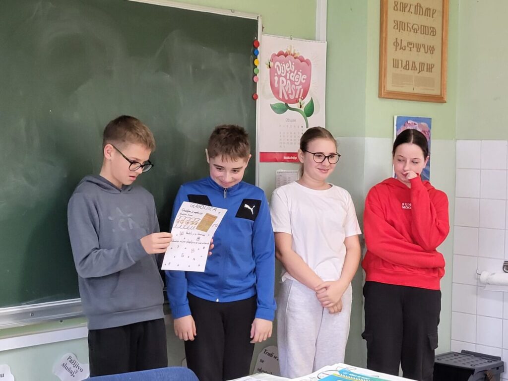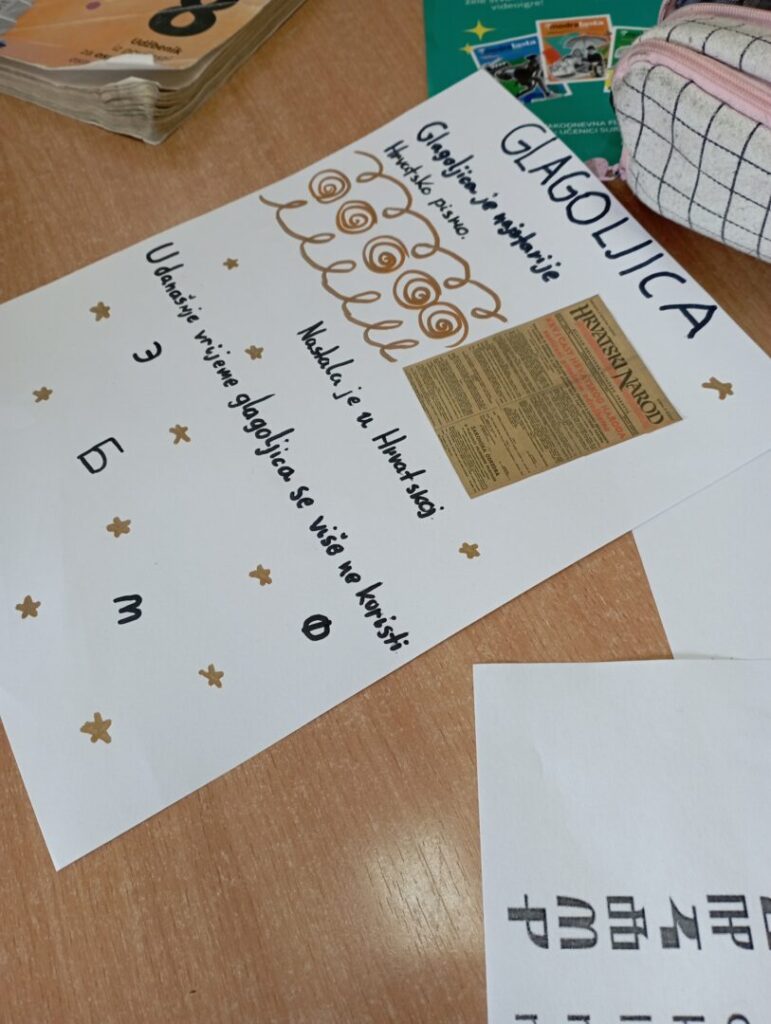 Nakon uvodnog dijela, učenici su svoje znanje primijenili u kreativnom radu po skupinama. Svaka je skupina dobila poseban zadatak: jedna je osmišljavala naziv i naslovnicu školskih novina, druga naslovnicu časopisa, treća je izrađivala plakat na zadanu temu, dok je četvrta skupina radila na izradi brošure. Kako bi zadatci bili još zanimljiviji i izazovniji, sve su skupine morale u dio svojega rada uključiti i glagoljicu.