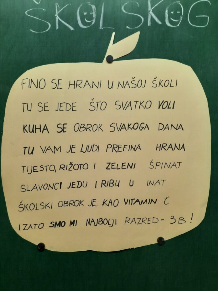 Već petu godinu obilježavamo Tjedan školskog doručka kako bismo djeci približili zdravu prehranu. Ovogodišnja tema tjedna bila je „Hranom oko svijeta“. Učenici su sa svojim učiteljima osmislili različite oblike obilježavanja ovog tjedna. Pripremali su zdrave obroke, sastavljali pjesmice, pjevali o zdravoj hrani, pisali kuharicu i još puno toga.