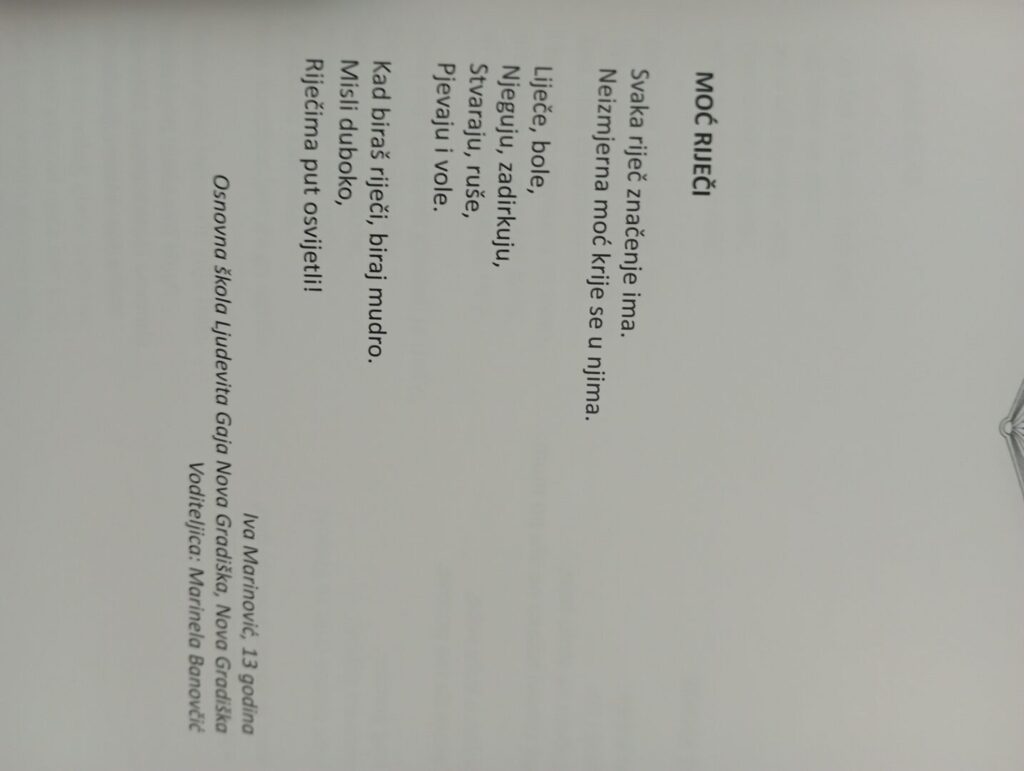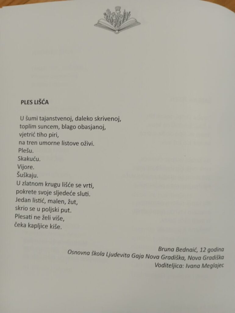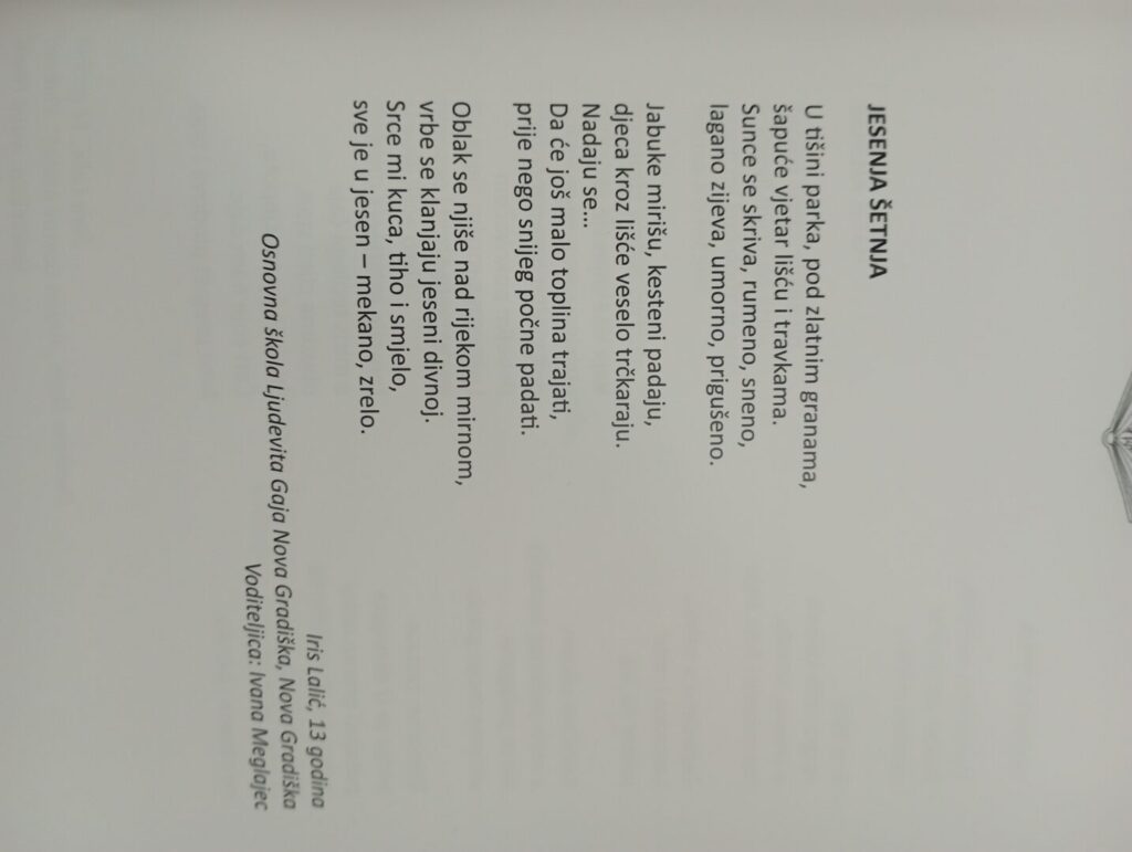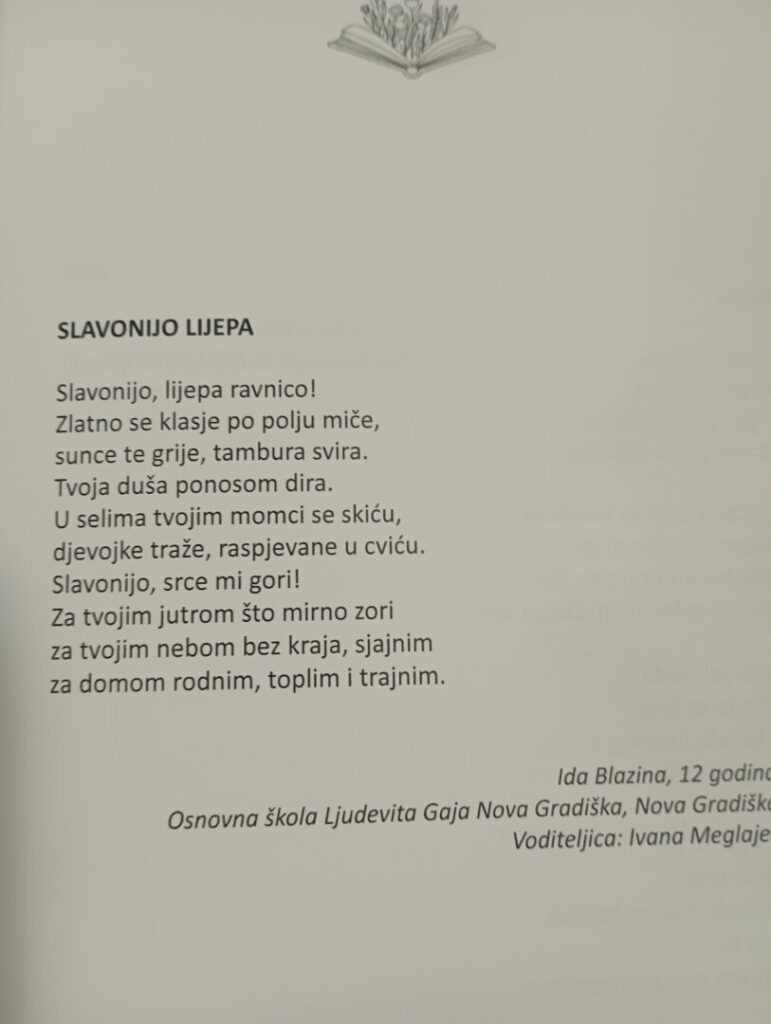 “Riječ je poput sjemena. Kada zrnce padne na plodno tlo – otvoreno srce, znatiželjnu misao ili dječju maštu – iz njega iznikne nešto prekrasno”, riječi su to urednice još jedne zbirke od četrdeset pjesama malih pjesnika iz cijele Slavonije i Baranje, a i šire. U zbirci su svoje mjesto našli i stihovi učenica OŠ Ljudevita Gaja Nova Gradiška koje su ih 28. studenog 2025. predstavile brojnoj publici u OŠ “Matija Gubec” Cernik. One su: Ida Blazina, Iris Lalić, Iva Marinović i Bruna Bednaić, a mentorice su učiteljice Ivana Meglajec i Marinela Banovčić.